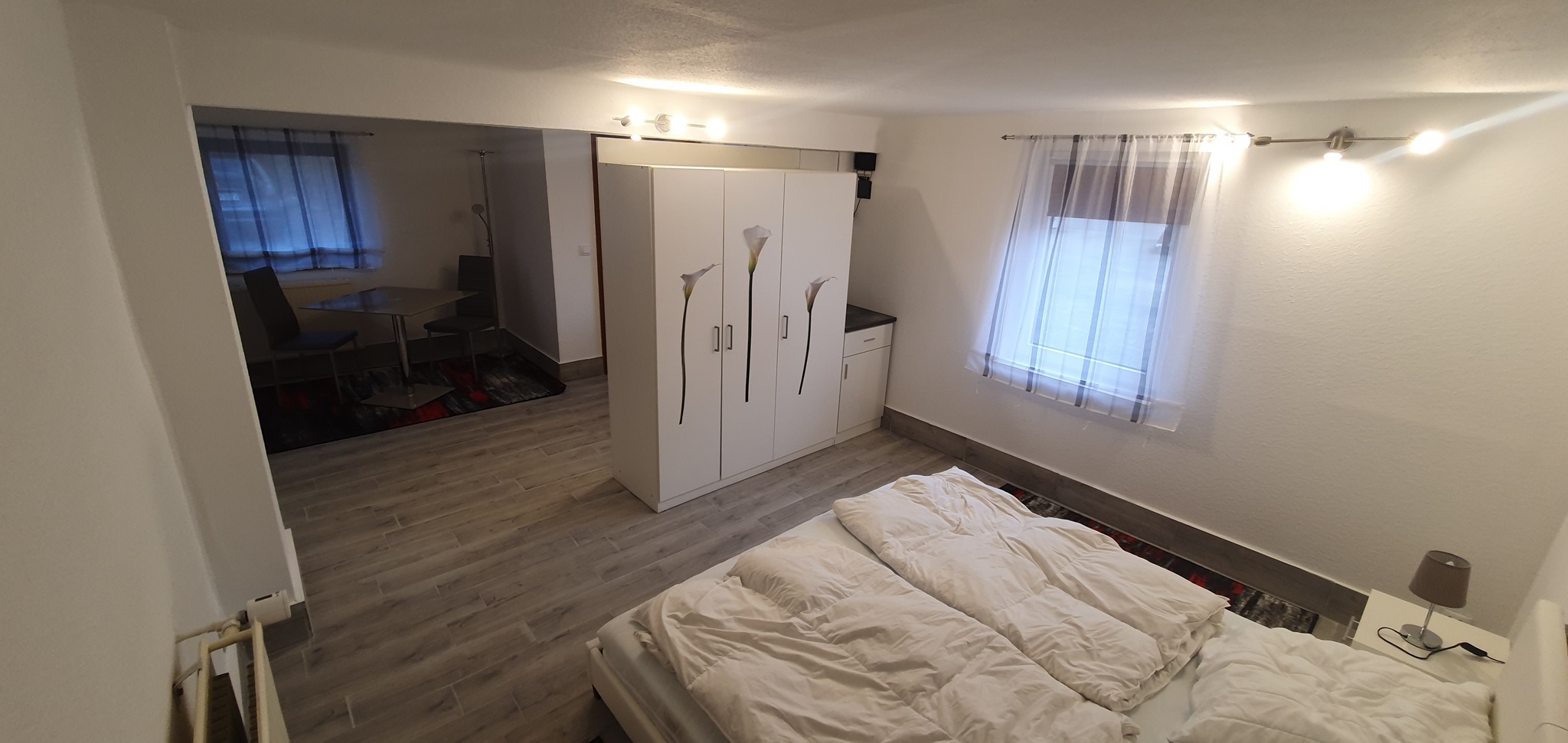 Das Zimmer 1 (ca 25m²) befindet sich im Erdgeschoss. Möbliert mit Doppelbett, Nachtschränkchen, geräumigem Kleiderschrank, Sideboard und Sitzmöglichkeiten. Als Besonderheit besitzt dieses Zimmer einen separaten Eingang vom Hof aus.