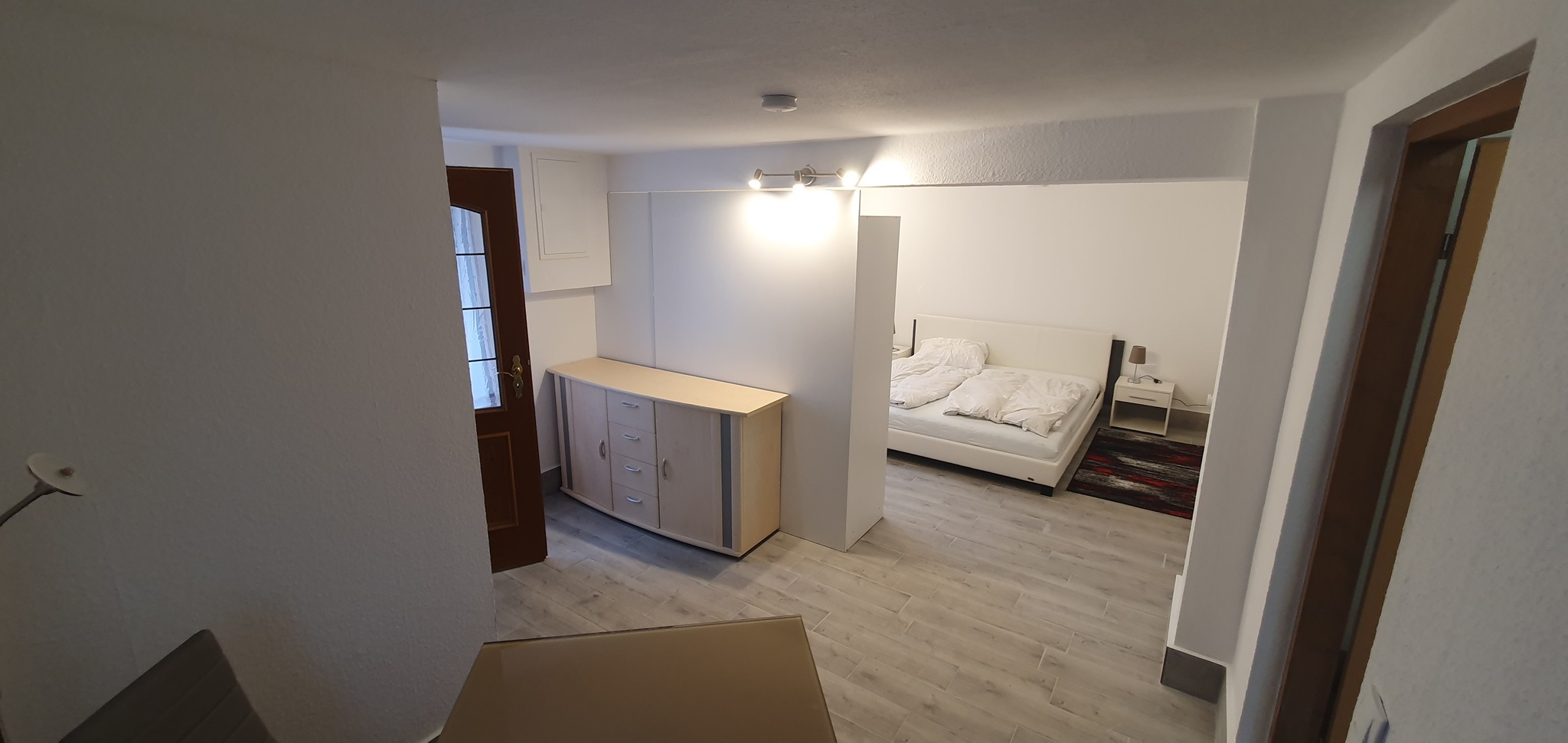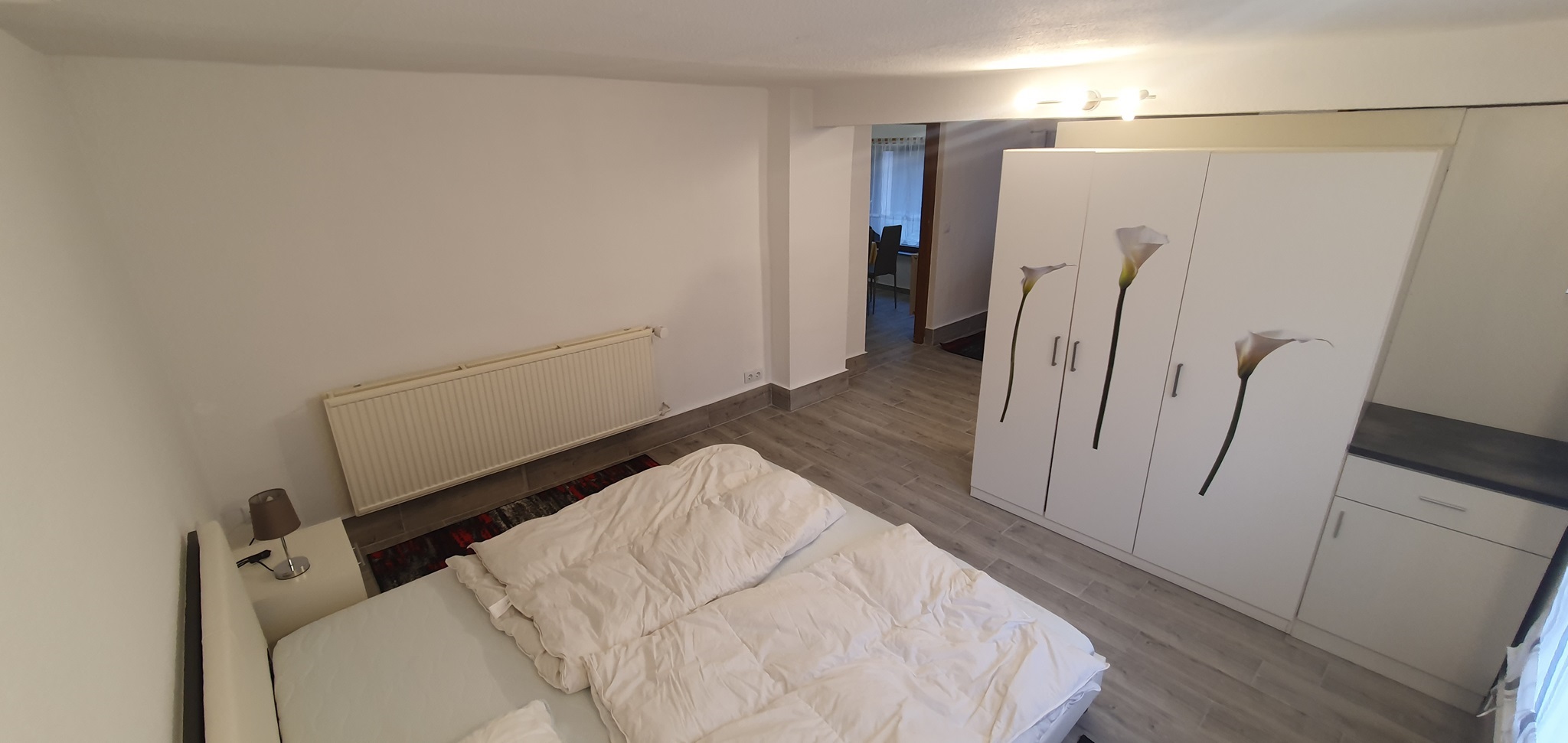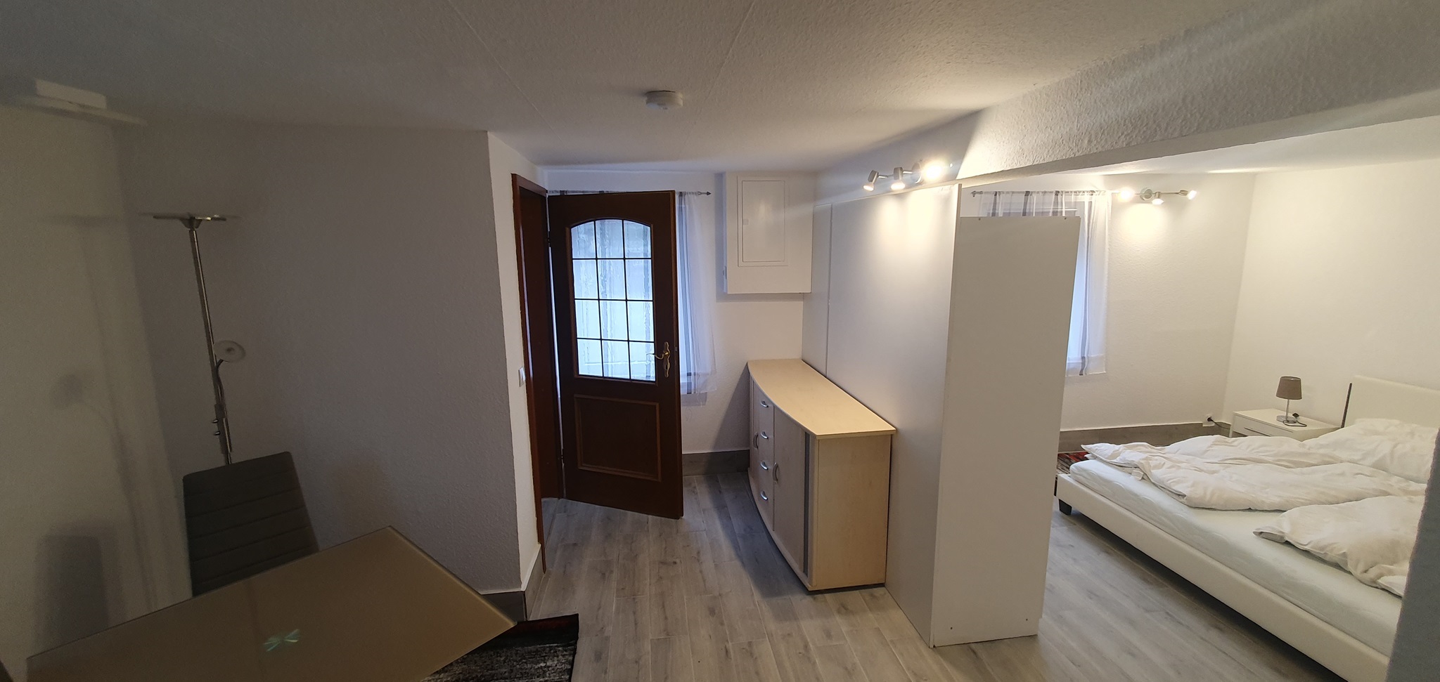 Das Zimmer 1 (ca 25m²) befindet sich im Erdgeschoss. Möbliert mit Doppelbett, Nachtschränkchen, geräumigem Kleiderschrank, Sideboard und Sitzmöglichkeiten. Als Besonderheit besitzt dieses Zimmer einen separaten Eingang vom Hof aus.
