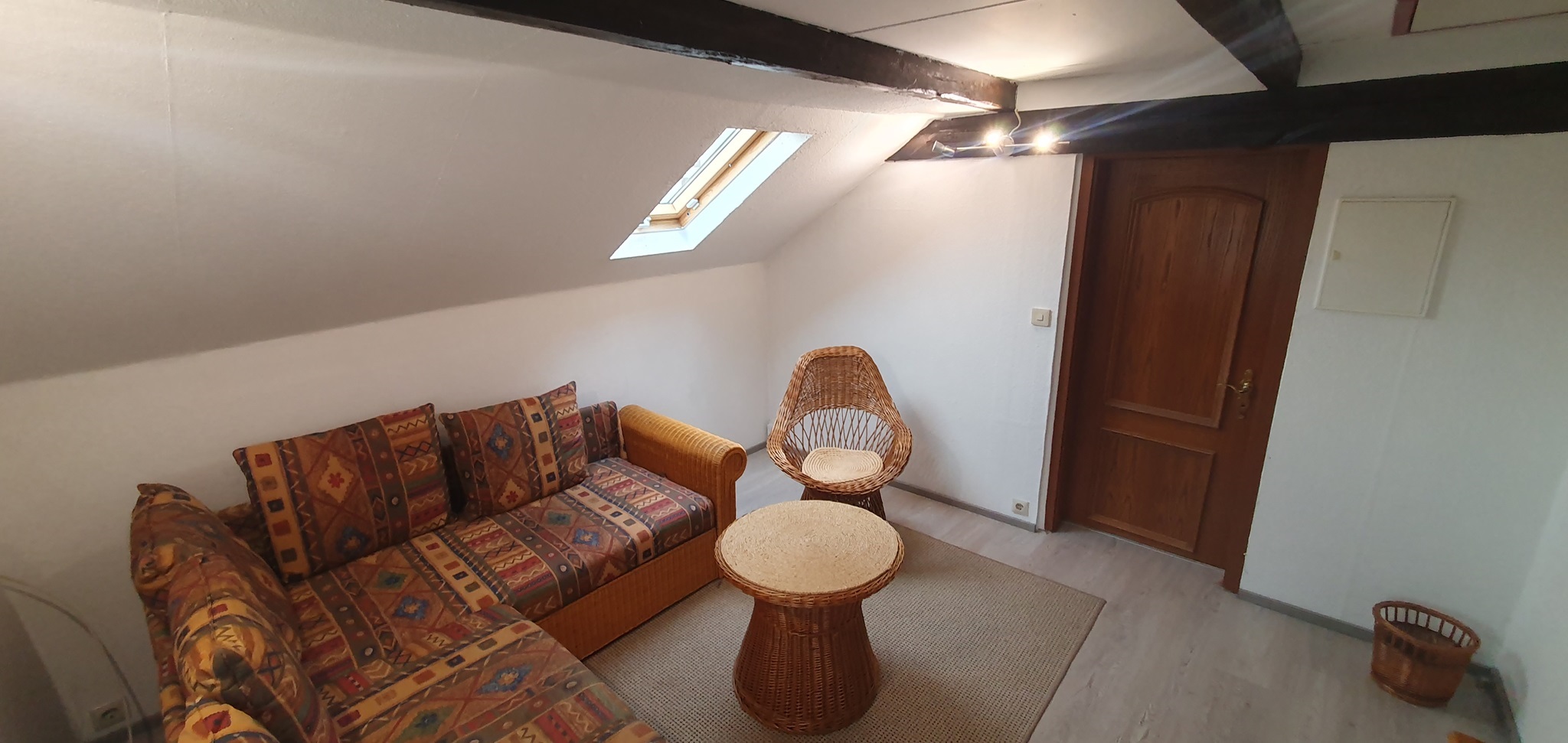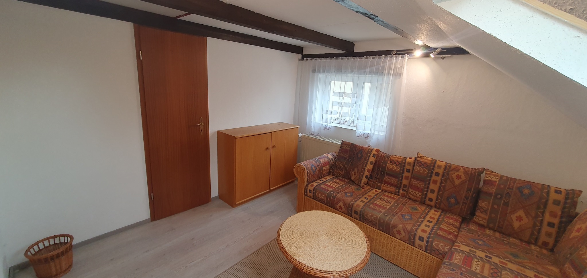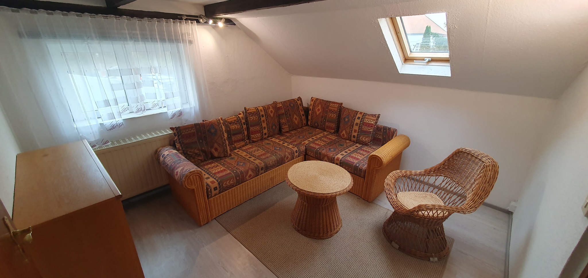 Dieser Privatbereich ist ca 22m² groß und unterteilt sich in Wohn- und Schlafbereich. Doppelbett, Kleiderschrank, Sideboard und eine gemütliche Korbcouch gehören zur Einrichtung. Als einziger der Privatbereiche verfügt dieser über ein kleines privates WC und einen Lagerraum im Spitzboden.